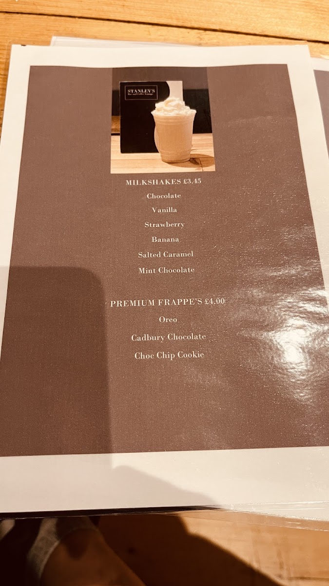 From a reviewer’s perspective, Stanley's Bar & Coffee Lounge on 50 Biggin St offers a menu that skillfully balances indulgence with comfort. Their Milkshakes-Chocolate, Vanilla, Strawberry Banana, and Salted Caramel-deliver a rich, creamy experience, while the Premium Frappe's like Oreo, Cadbury Chocolate, and Choc Chip Cookie are decadent treats that feel more like desserts than drinks. For something savory, the Toasted Sandwiches, including Ham & Cheese, Cheese & Tomato, Cheese & Onion, and Green Chilli & Mango, are satisfying, with the latter adding a surprising twist of flavor. The Jacket Potatoes, served Plain With Butter, with Cheese, Beans, Chilli, or Veg Chilli, are hearty and comforting, perfect for a quick meal or a light lunch. Overall, the menu demonstrates a thoughtful selection of classic favorites with a few creative touches, making Stanley's an inviting spot for anyone craving both sweet and savory options in Dover.